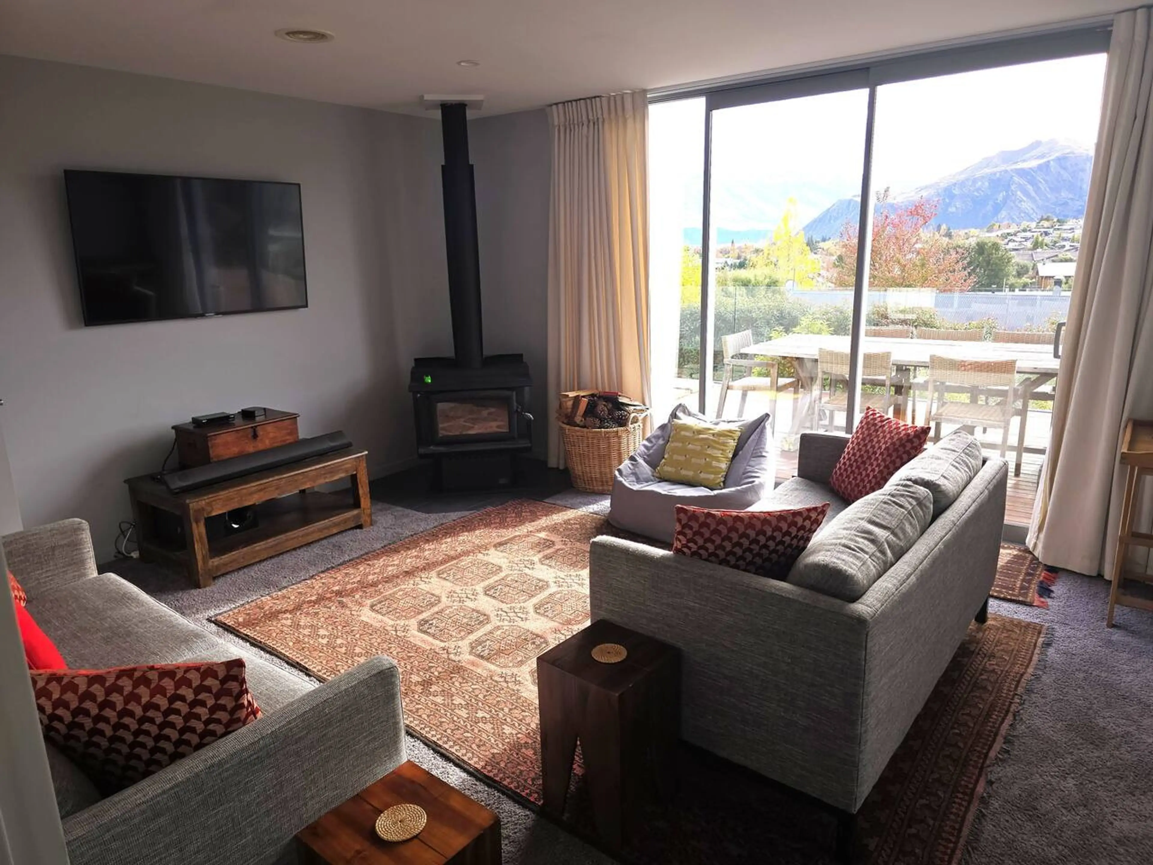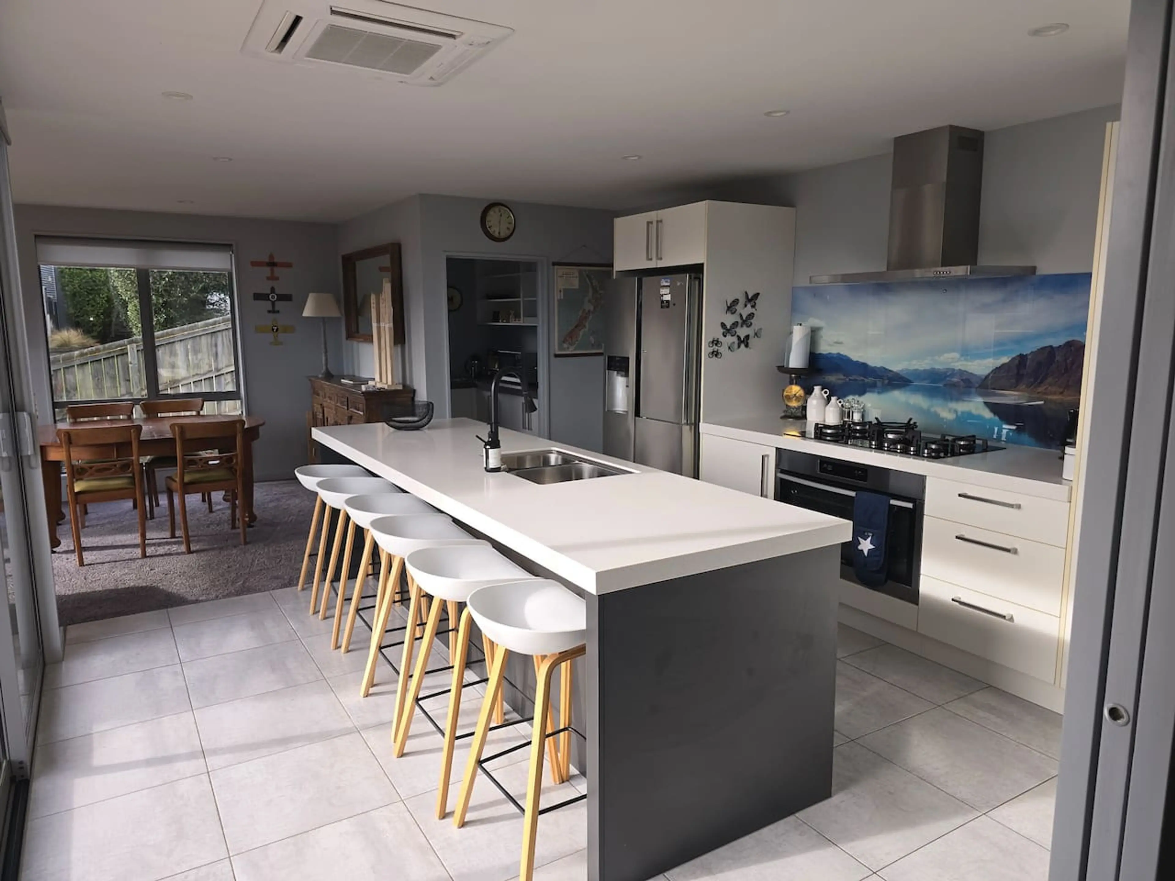 Negative: The kitchen, living room and the master bedroom all have large glass doors open to the deck, and are exposed to the sun. Even with the curtains closed it got very hot in the afternoon but the air conditioning works only in the kitchen and the dining room next to it. There is no air-conditioning in all the bedrooms.